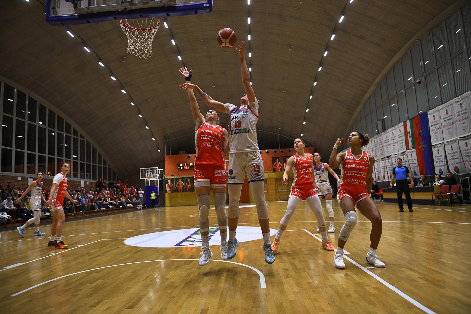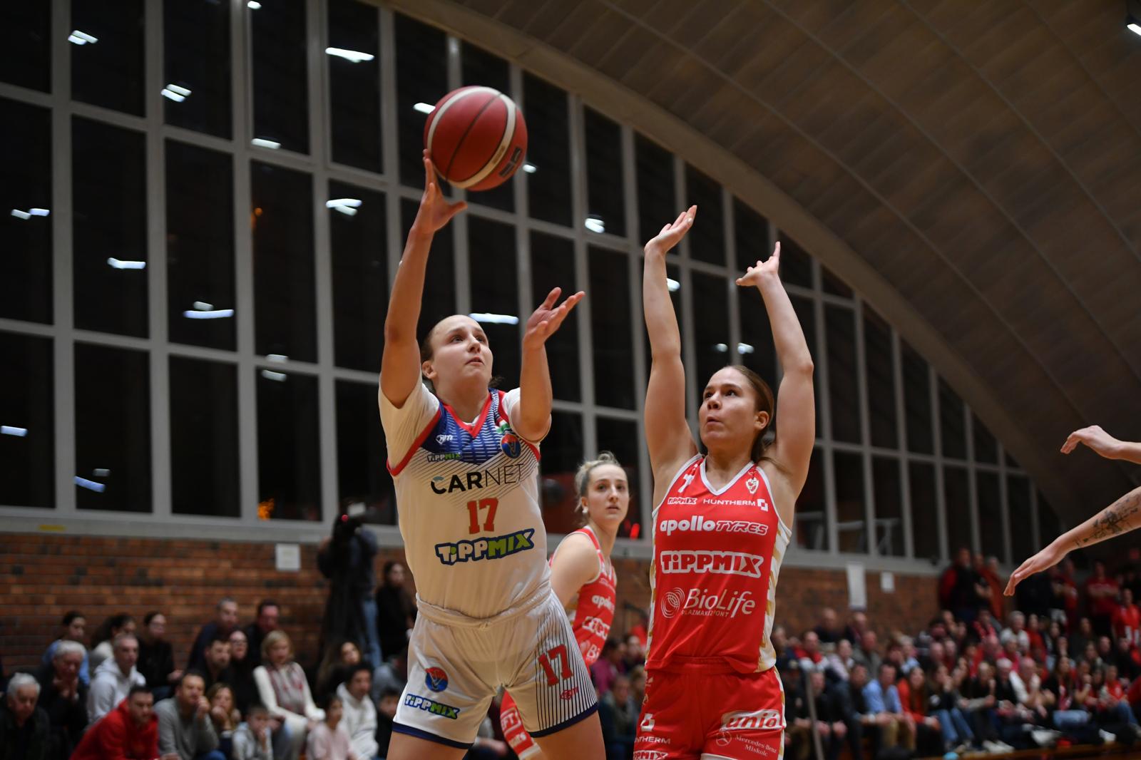 Mayr Lara és Kiss Angi összjátékából született a második játékrész első találata, fiatal irányítónk remek labdát adott a befutó centerünknek. Kiss Angi játékára alapoztunk az első percekben, aki nemcsak támadásban, de védekezésben is bőven kivette részét a játékból. Angyal Barbi egy hárompontost is betett a közösbe, amivel két pontra sikerült zárkóznunk. Grigalauskyte támadóhibáját követően látták elérkezettnek az időt a vendégek, hogy rendezzék soraikat egy időkéréssel. Kányásit előbb még sikerült blokkolnia Angyal Barbinak, az alapvonali bedobást követően azonban újra hozzá került a labda, és ezúttal üresen dobhatott. Mayr Lara bátor betörését követően Aho Tyra robogott végig a pályán, majd Ginzo is megtette ugyan ezt. Fokozta a ritmus a DVTK, hat pontra elhúztak, ami ezúttal hazai időkérést eredményezett. Szirony Dorina triplájával zárkóztunk, ám Ginzo azonnal válaszolni tudott egyéni akcióból, gyűrűt talált a hátralépős középtávoli. Véleményes szituációt követően gyűjtötte be Jáhni Zsófi harmadik faultját, majd egy Takács-Ginzo összjátékot tapsoltak meg a vendég szurkolók. Szirony Dorina triplájával tudtunk zárkózni, ám a két diósgyőri légiós látványos passzai zavarták meg a hazai védelmet. Takács hárompontosa zárta az első félidőt, amivel a DVTK a mérkőzés folyamán először alakított ki kétszámjegyű különbséget.