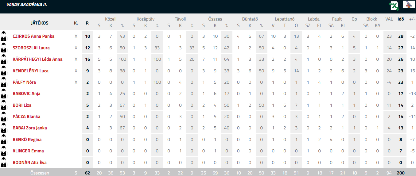 Egy remek hangulatú mérkőzést játszottunk a Csata DSE-vel. Voltak kisebb hullámvölgyek, de összességében a mi kezünkben volt a sorsunk, kontrolláltuk a meccset. Ennek ellenére tartogatott némi izgalmat az utolsó pár labdabirtoklás. Örülünk a kiemelkedő egyéni teljesítményeknek (Kárpáthegyi Léda 20 IBM, Kendelényi Luca 22 IBM, Czirkos Panka 20 IBM), de csapatként is jól szerepeltünk – mondta a csapat edzője, Kovács Martin.